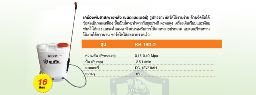 สำหรับผู้ที่สะดวกใช้งานกับเครื่องพ่นยาแบตเตอรี่ แนะนำเครื่องพ่นยาขุนศึก ขนาด 16 ลิตร ใช้งานง่าย ใช้ได้ยาวนาน ในราคาย่อมเยาว์