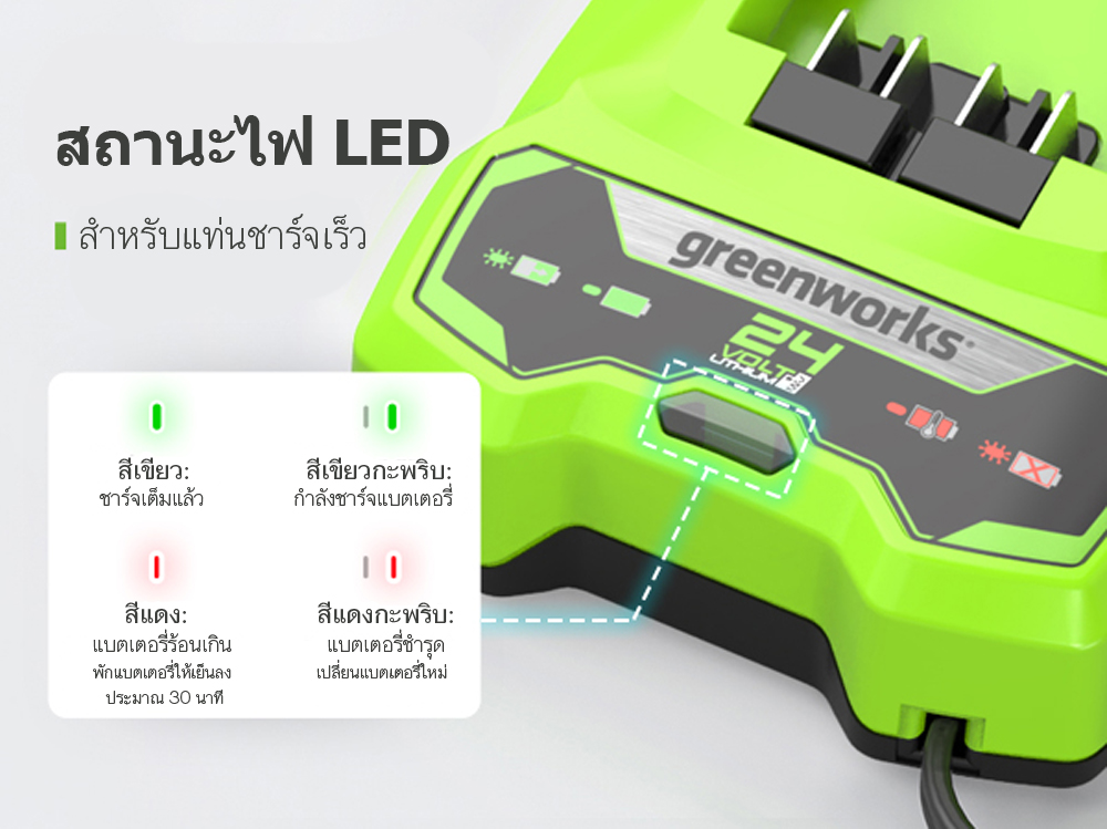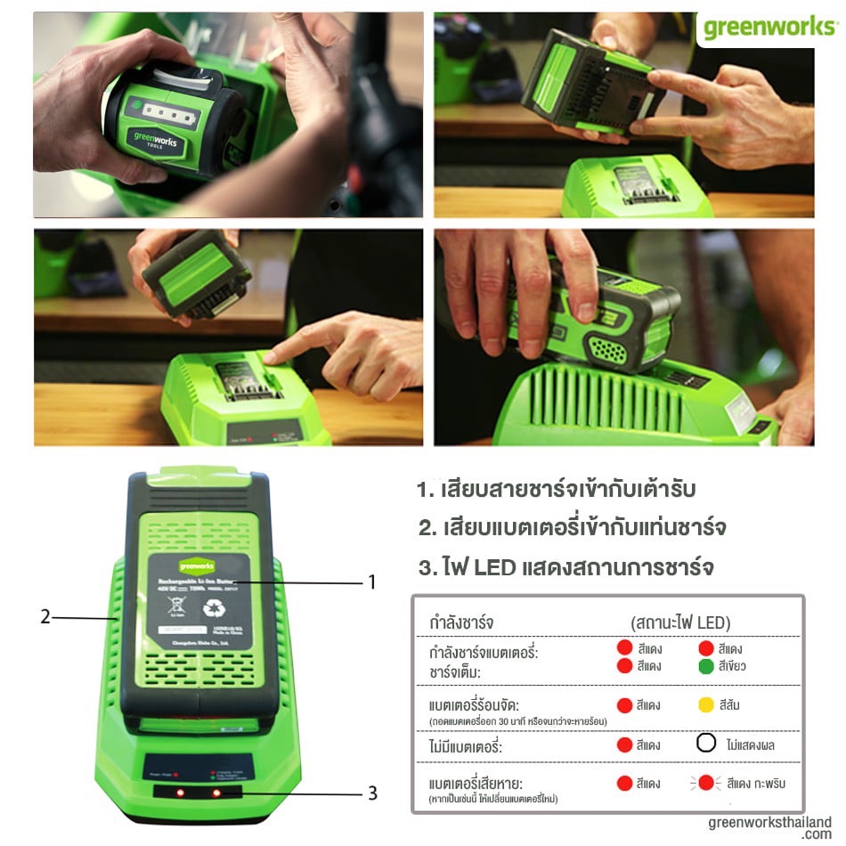วิธีการดูสถานะแบตเตอรี่ Greenworks จากแท่นชาร์จ ซึ่งวิธีการดูสถานะจะช่วยให้สามารถใช้งานได้อย่างถูกต้อง และดูแลได้อย่างถูกวิธี
