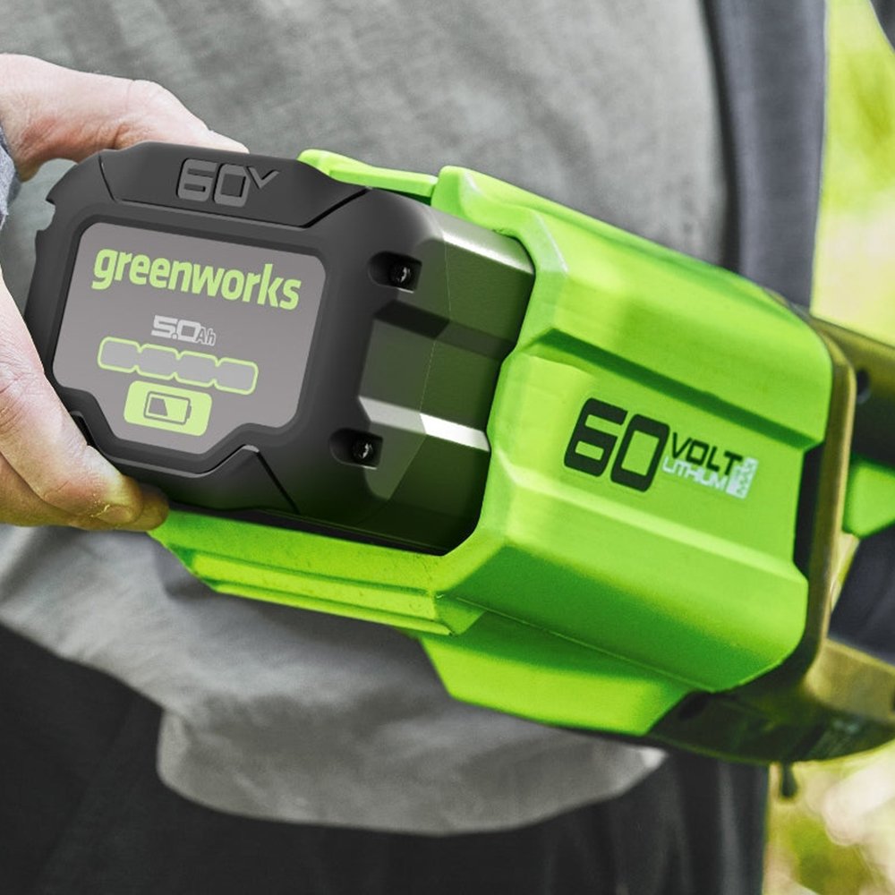The GREENWORKS 60V 5Ah battery is a premium lithium-ion battery designed for heavy-duty use. Built with durable materials and rated IPX5, it is resistant to rain and moisture, ensuring reliable performance in tough conditions.